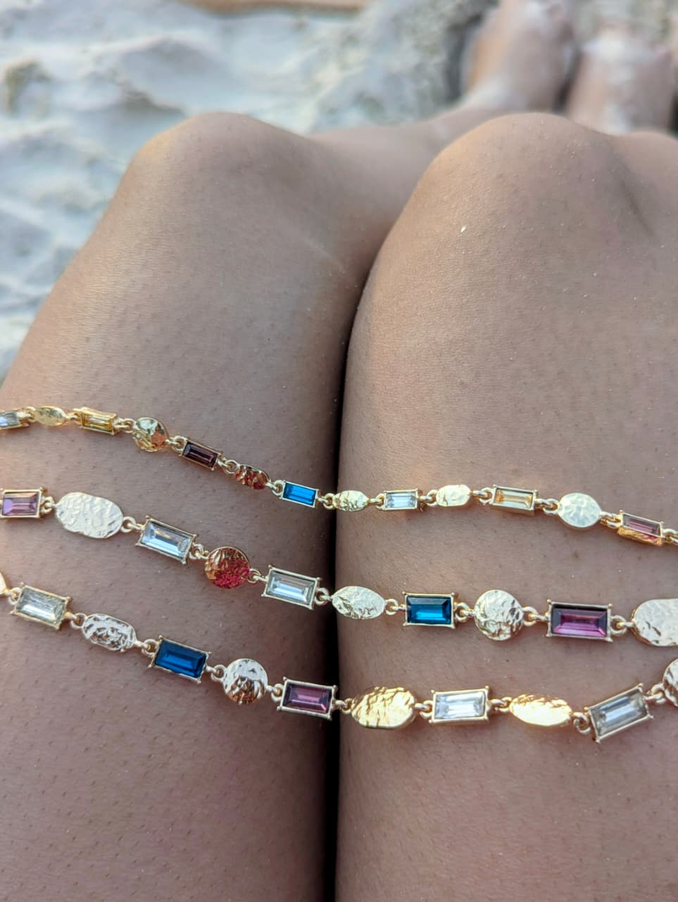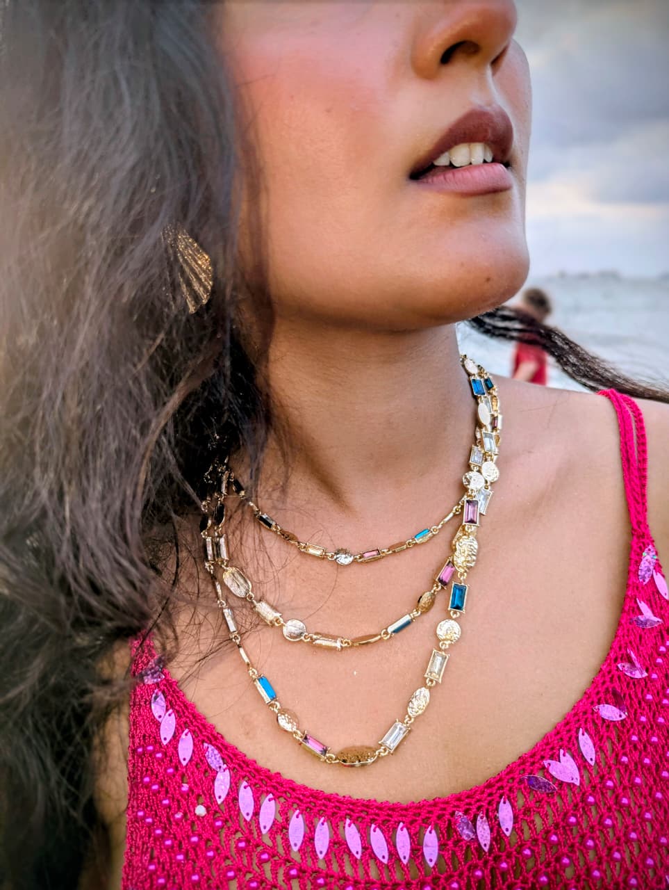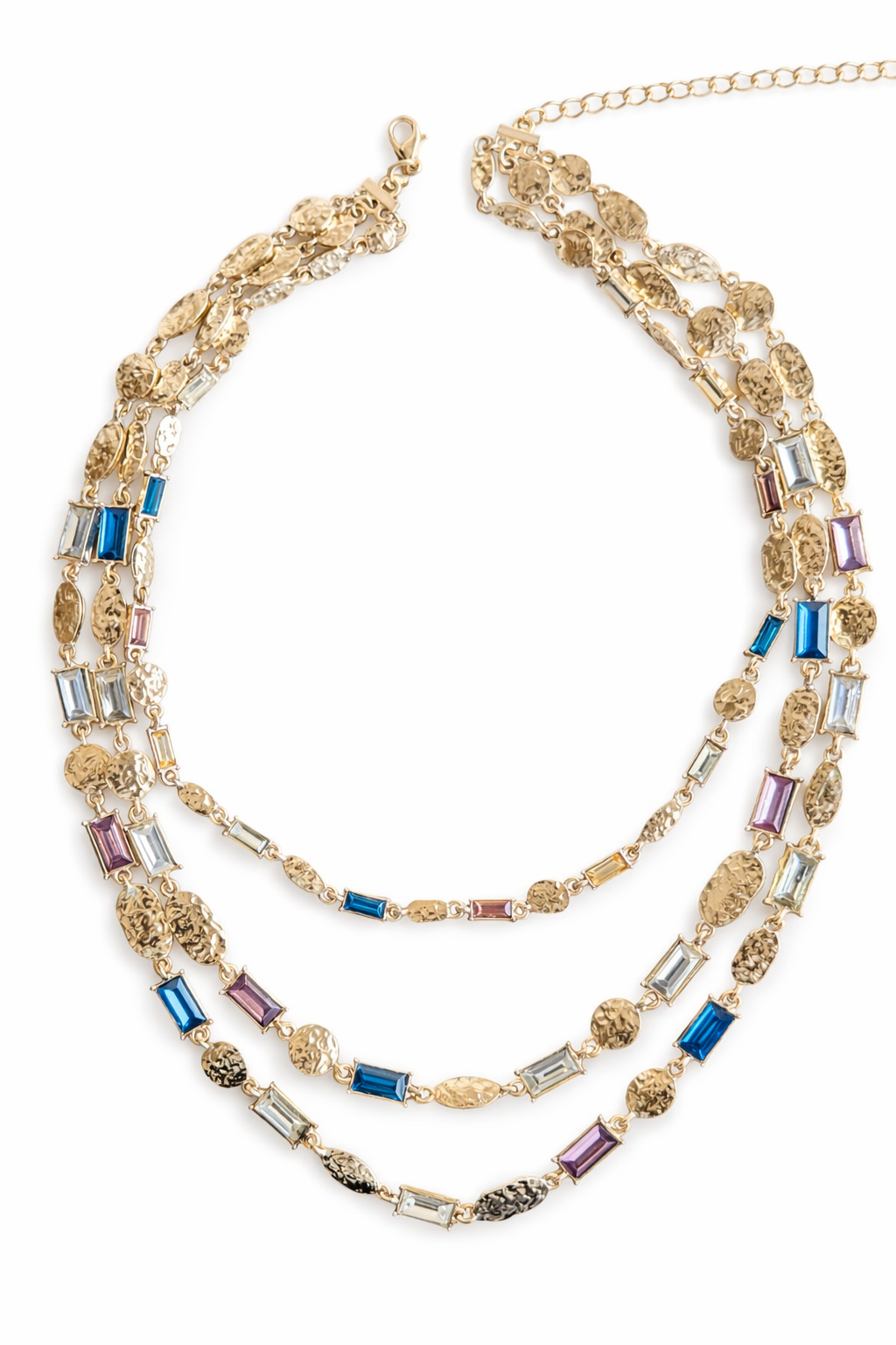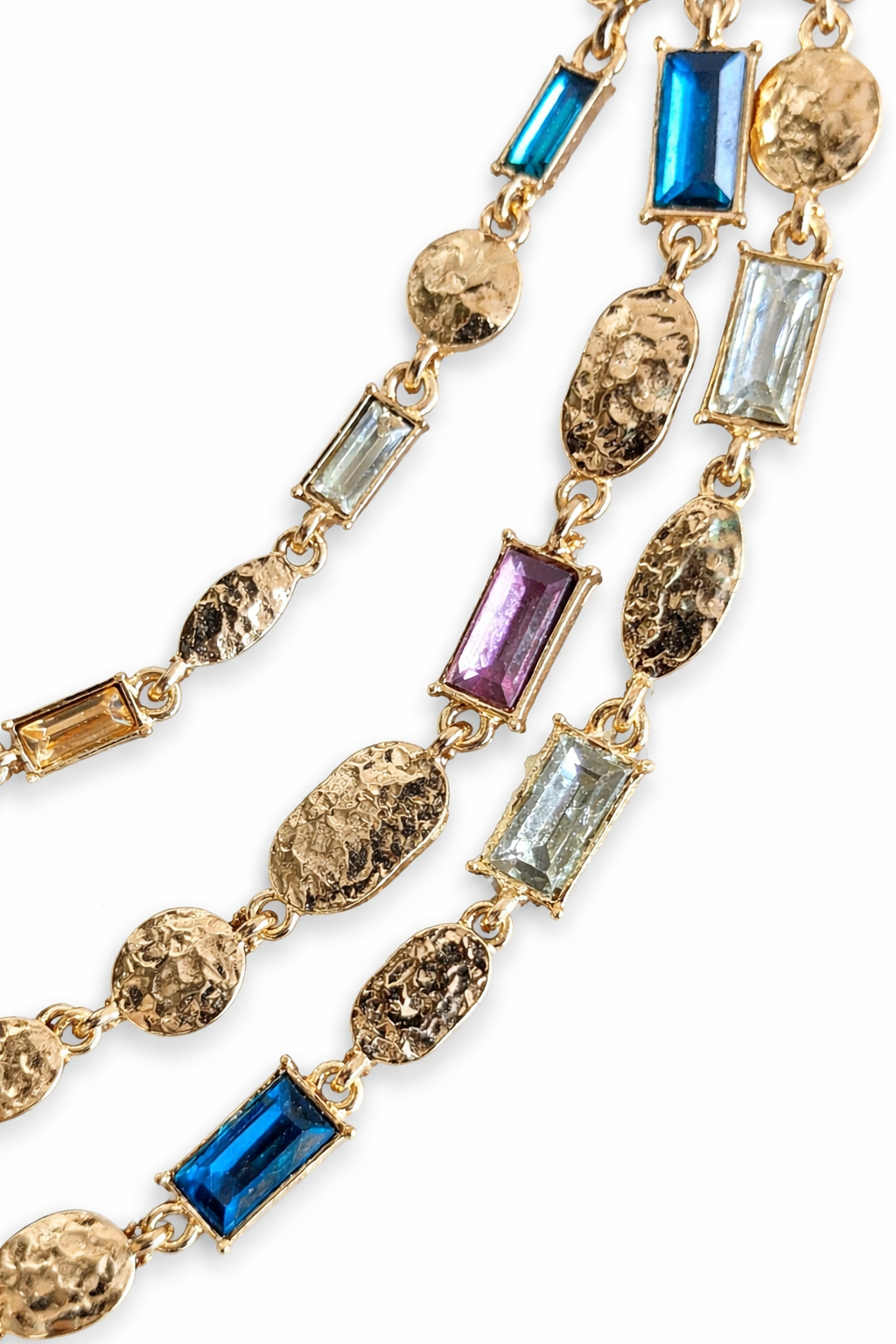 Bold layers. Electric energy. The Prism Drip Necklace blends textured gold-tone chains with vibrant prism-cut crystal accents in blue, lilac, and clear tones. Designed to reflect light from every angle, this multi-layer piece gives you that stacked look in one effortless statement.